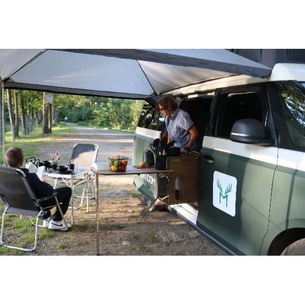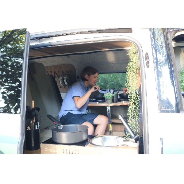 Koken onderweg? Dat doe je zoals het jou past. Aan de zijkant van de camper vind je een slim draaibaar kookeiland met twee inductiekookplaten en een spoeltafel. Zet de schuifdeur open, draai de keuken naar buiten, klik het uitschuifbare tafelblad eraan vast en start je dag met een vers ontbijt of een warme koffie. Wil je liever binnen koken? Ook dat kan moeiteloos, met de keuken naar binnen of halfopen in de deuropening.